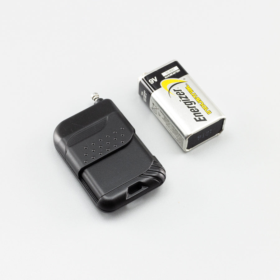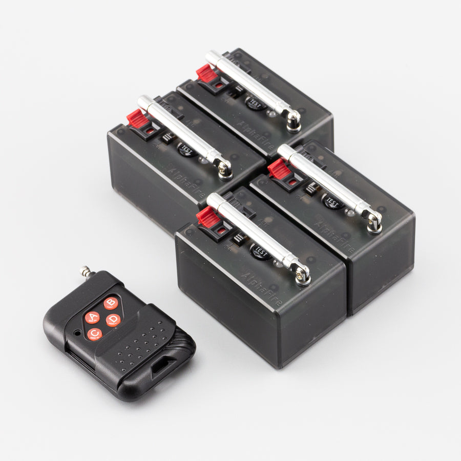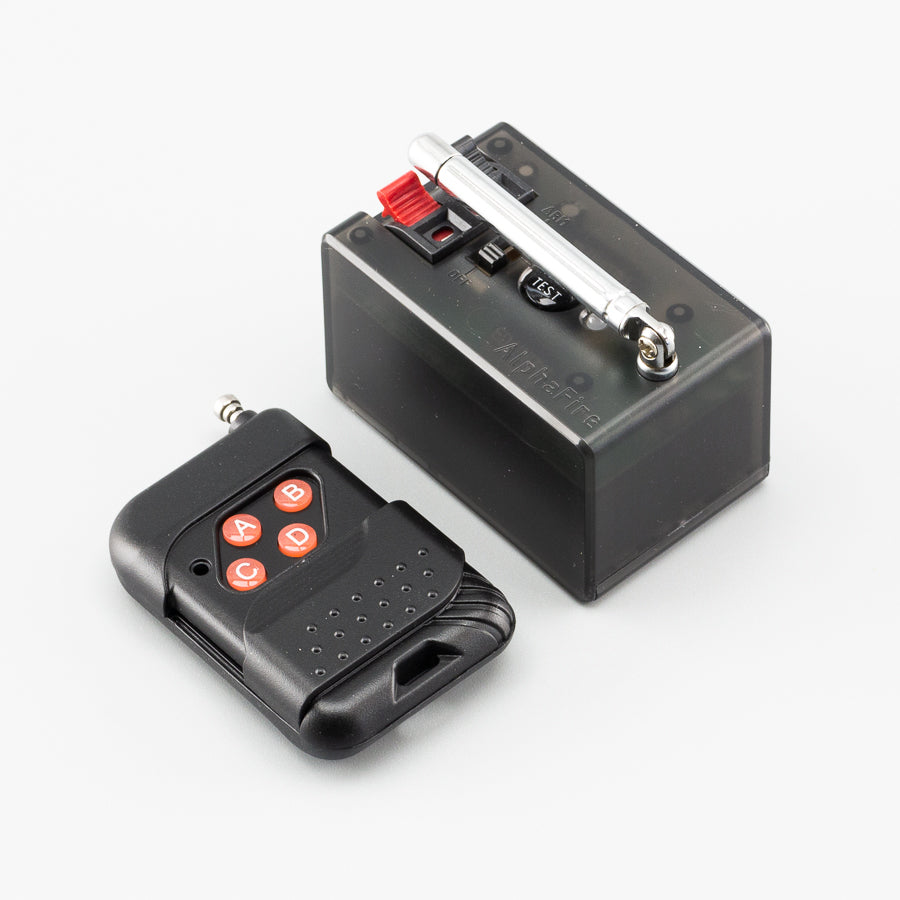 The remote firing system receiver is programmed to "learn" a remote control transmitter. Pressing the remote control button then fires all receivers that have "learned" the remote control.